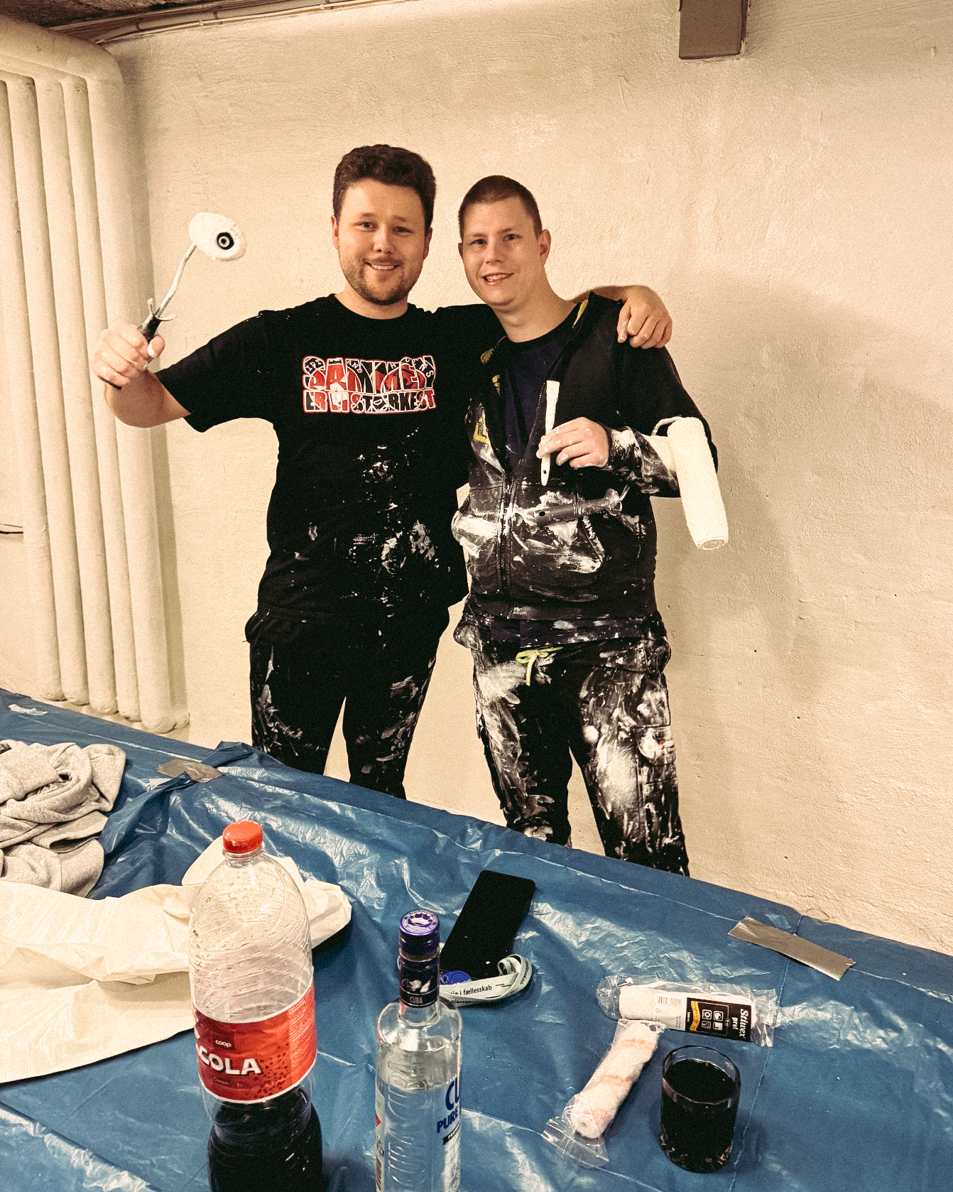 Tænk mørkegrønt. Militærmørkegrønt. Så har du farven på de kældervægge, som Frederik har givet en kærlig hånd. ”Det var Nicolai, der fik den strålende idé at opgradere rummet,” forklarer Frederik og skæver til Nicolai, der arbejder som bostøtte på vores støttecenter på Poul La Cours Vej.