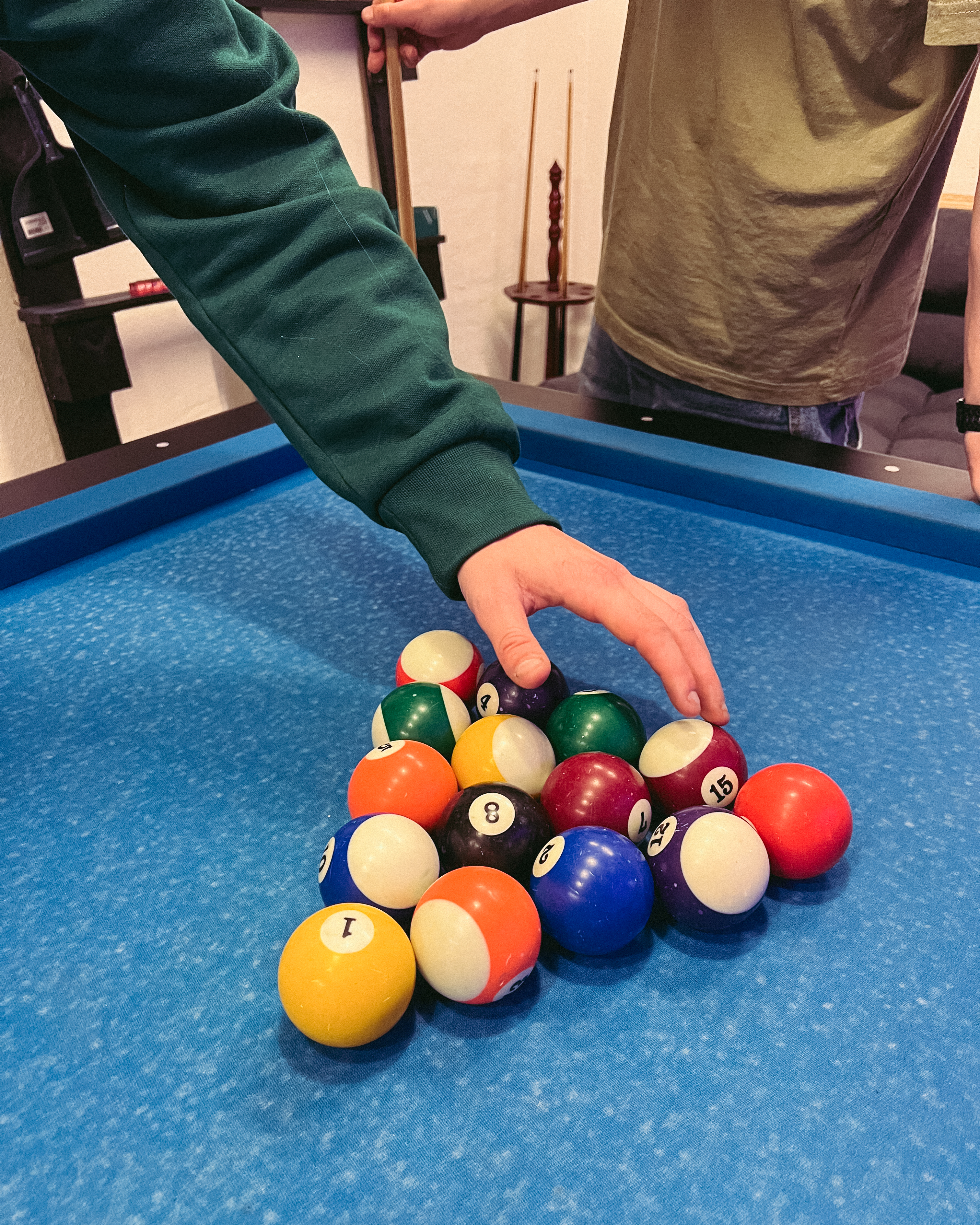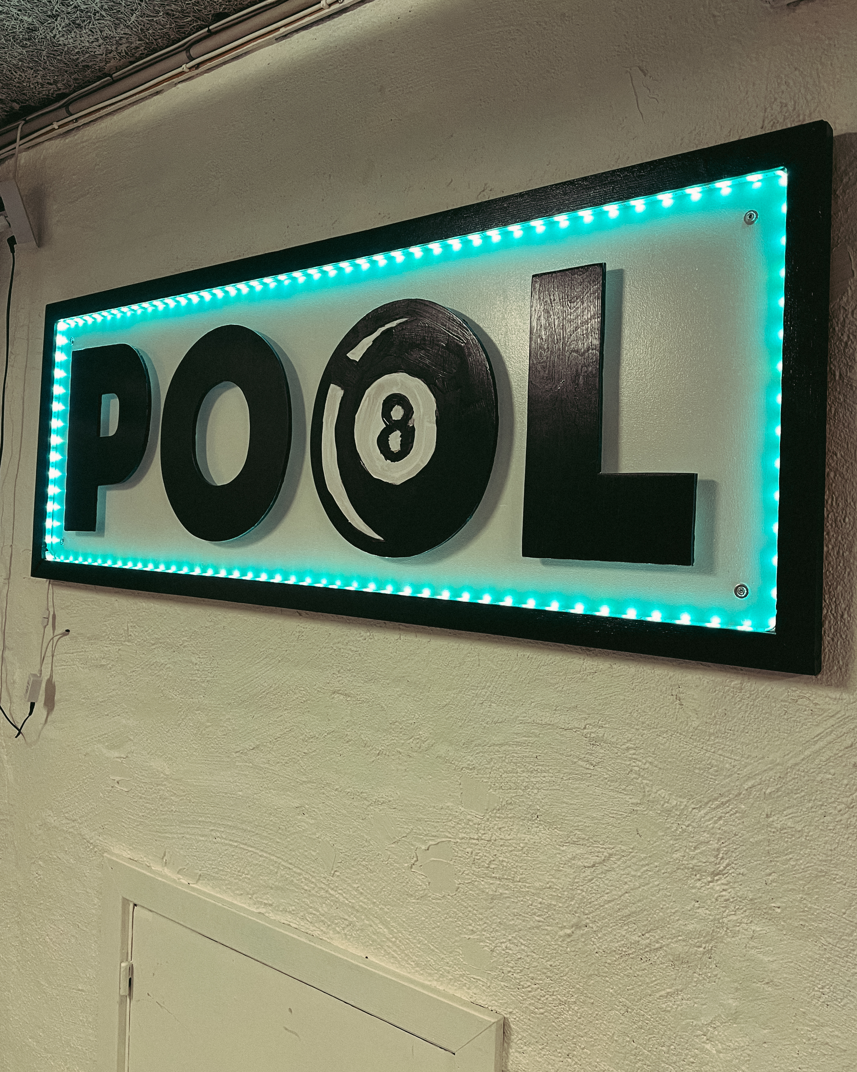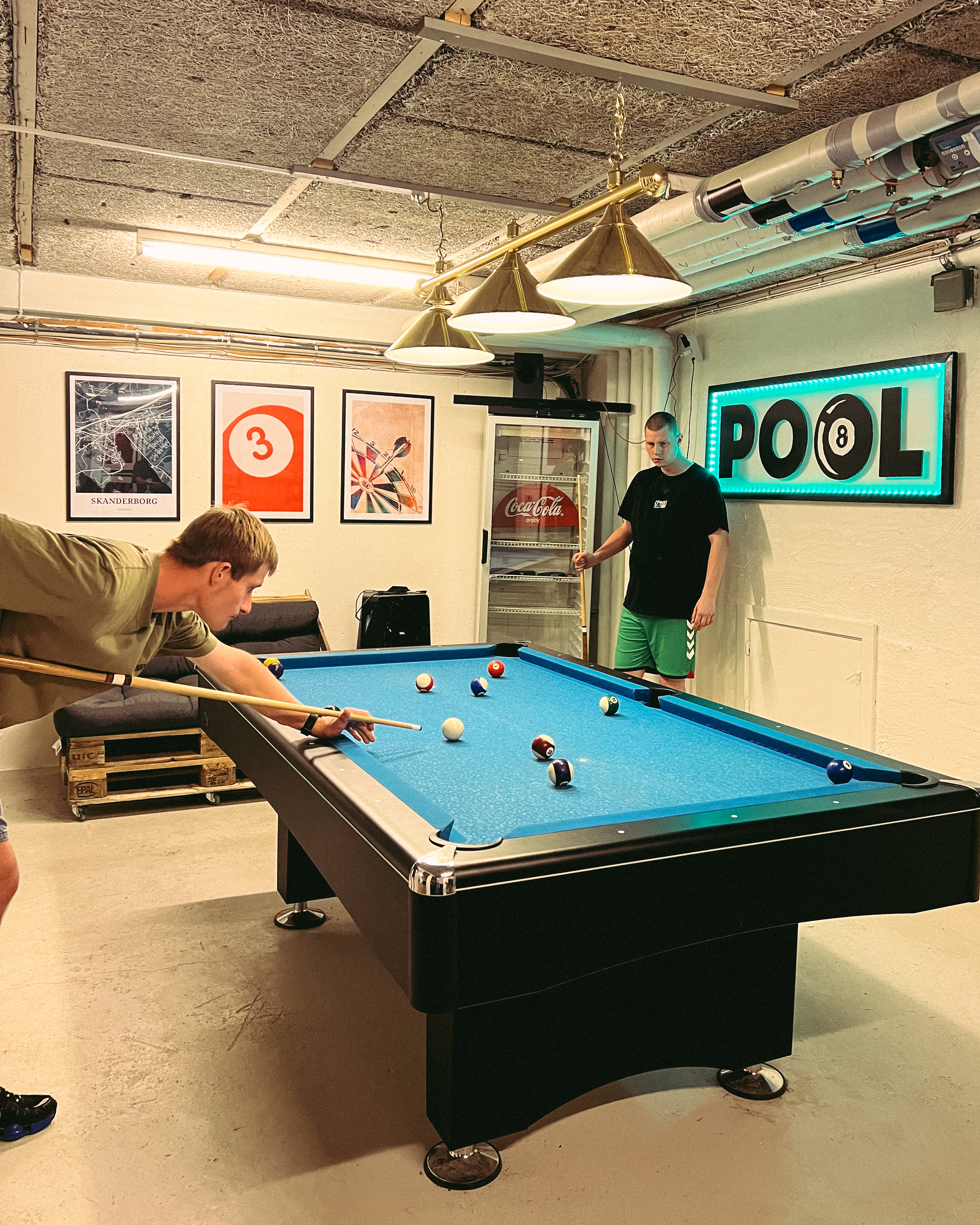The Weeknd’s ’Blinding Lights’ brager ud af højtalerne, mens Frederik og Niklas er gået i gang med et spil pool. Netop ’POOL’ står der på et dekorativt, sort skilt bag dem. Det er en kollega og et par brugere fra Brunhøj, som har skåret bogstaverne ud, hvorefter Niklas har malet det. ”Lyskæden rundt om var én, jeg havde. Den lå bare og samlede støv, så den kunne ligeså godt komme herned og gøre lidt nytte,” siger Frederik, inden han igen peger billardkøen mod den næste kugle.
